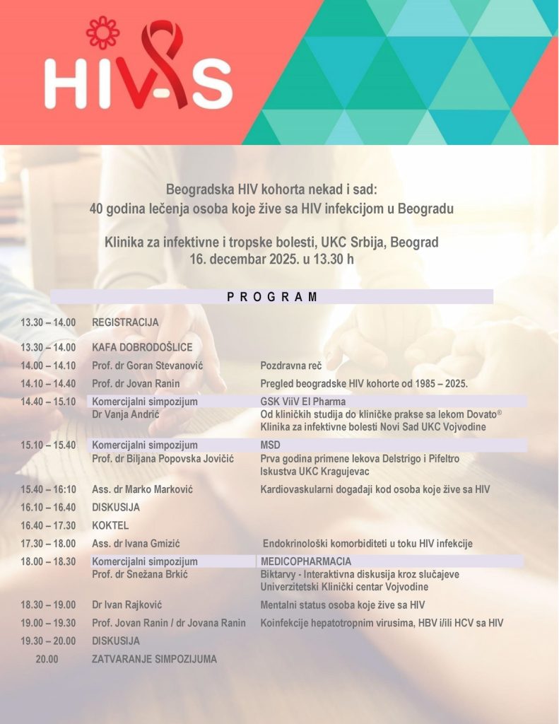 U ime Organizacionog odbora HIVAS-a, želimo da Vas srdačno pozovemo da se pridružite i podržite ovaj važan stručni događaj, Jubilarni Simpozijum i obeležavanje 40. godina odeljenja za HIV-AIDS Klinike za infektivne i tropske bolesti, kao i promociju rezultata neposredno završenog projekta izrade Beogradske HIV kohorte, koji će se održati u utorak, 16. decembra 2025. godine, u svečanoj Sali Klinike za infektivne i tropske bolesti UKCS u Beogradu, od 13.30 h.